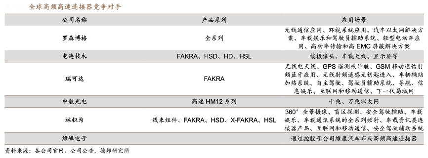 經典案例:根據各公司官網、公司公告、德邦研究所等綜合資訊表明,從高頻高速競爭格局來看,國外廠商在車載高速連接器研發上起步較早, Mini-Fakra、以太網這兩大類連接器,國內標準界面相對空白,為國產替代提供了可能。但已經有部分上市連接器企業進行相關的技術攻克——電連技術和華為合作開發以太網界面,產品已成熟導入整車廠,目前維峰電子公司也已通過子公司維康汽車重點部署高頻高速連接器。