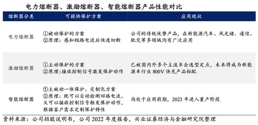 經典案例:根據公司招股說明書、公司2022年度報告、興業證券經濟與金融研究院等綜合資訊表明,新能源汽車和風光儲行業應用電壓不斷提高,對熔斷器的性能也提出更高要求,中熔電氣公司推出激勵熔斷器和智能熔斷器,以快速響應下游產業需求。激勵熔斷器允許用戶提前設定好條件,接收控制信號后發生熔斷,這是一種主動保護的方案。