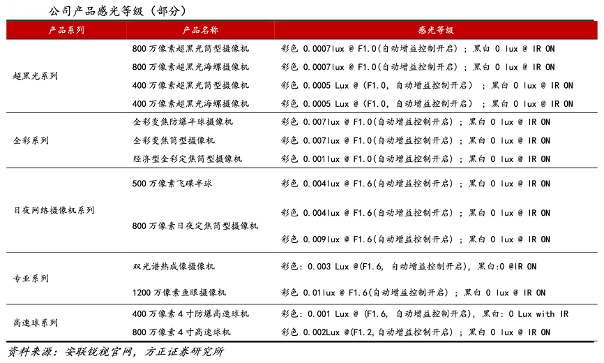 經典案例:根據安聯銳視官網、方正證券研究所等綜合資訊表明,安聯銳視核心業務攝像機產品性能領先,感光等級已達行業最高水準。在前端攝像頭領域,夜視圖像效果是監控攝像機選型的重要考量。目前感光等級可分為普通紅外、星光、超星光、黑光等級別。其中,黑光攝像機的綜合感光能力能夠達到紅外攝像 機的 9.36 倍、星光攝像機的 3.3 倍,是目前行業內最為領先的產品類型。