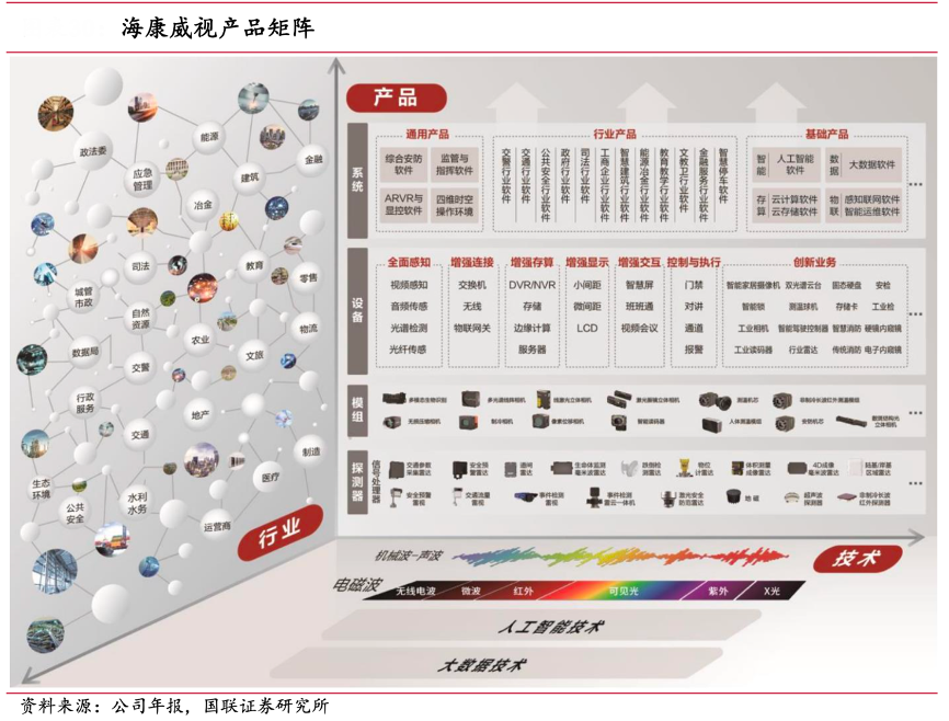 經(jīng)典案例:根據(jù)公司年報(bào)、國聯(lián)證券研究所等綜合資訊表明,海康威視憑借多維感知、AI、大數(shù)據(jù)等技術(shù)優(yōu) 勢,拓展了從探測器到系統(tǒng)解決方案的 30000+種硬件產(chǎn)品,覆蓋了 10 大行業(yè)、70 多 個(gè)子行業(yè)的 300 多個(gè)細(xì)分場景。