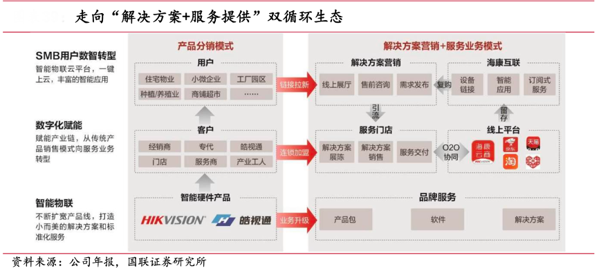 經典案例:根據公司年報、國聯證券研究所等綜合資訊表明,海康威視深耕下沉市場,與全國合作伙伴共建“解決方案營 銷+服務提供”的雙循環生態,打造線上線下數字化門店,構建覆蓋全國的服務網格,助力中小企業數字化轉型。截至 2022 年末,公司在中國大陸擁有 32 家省級業務中心、300 多個城市分公司,渠道網絡覆蓋國內絕大多數地級以上城市,渠道優勢突出。
