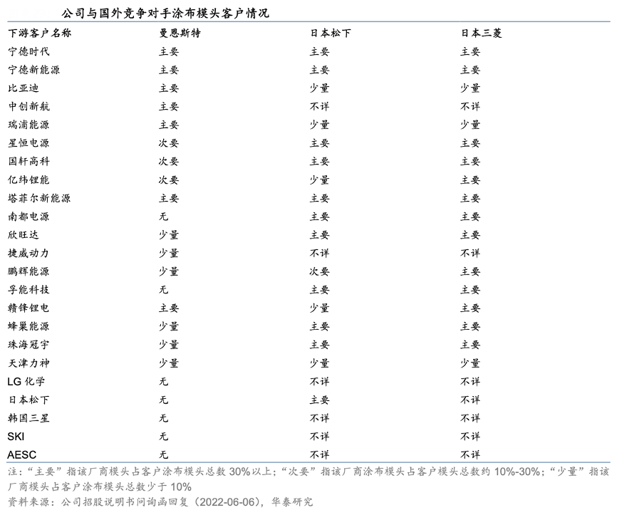 經(jīng)典案例:根據(jù)公司招股說明書問詢函回復(fù)、華泰研究等綜合資訊表明,曼恩斯特公司涂布模頭自 2017 年開始逐步替代進口品牌,目前公司覆蓋了動力鋰電池全球排行前十的絕大多數(shù)優(yōu)質(zhì)客戶資源,并與國內(nèi)外知名 3C 數(shù)碼鋰電企業(yè)、鋰電設(shè)備制造商建立了合作。在動力和儲能鋰電池領(lǐng)域,公司與寧德時代、 LG 新能源、比亞迪、中創(chuàng)新航、國軒高科、億緯鋰能等國內(nèi)外知名企業(yè)建立了穩(wěn)定的合作關(guān)系。