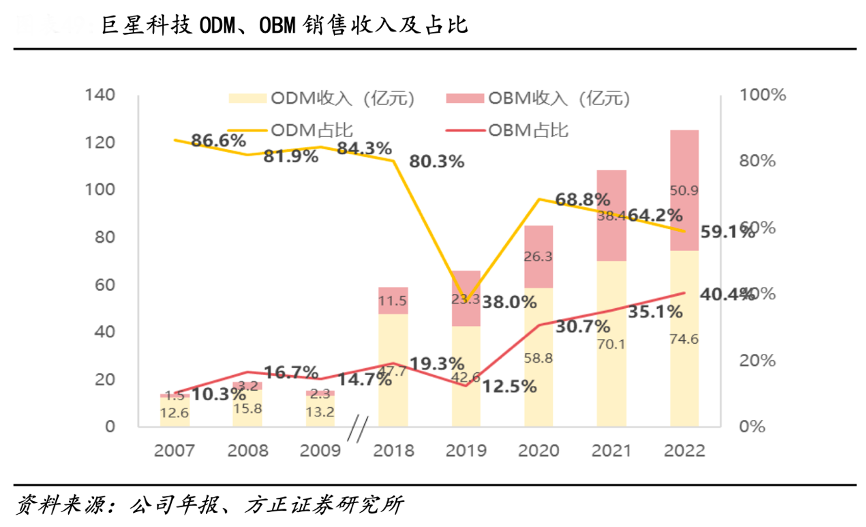 經典案例:根據公司年報、方正證券研究所等綜合資訊表明,巨星科技為全球手工具產品的龍頭企業,早期公司以 ODM 商業模式起家,目前公司仍然主要采用 ODM 的經營模式,但同時 OBM 的銷售金額逐年上升。2022 年公 司 ODM(客戶品牌)占比為 59.14%,OBM(自有品牌)收入占比上升至 40.35%。