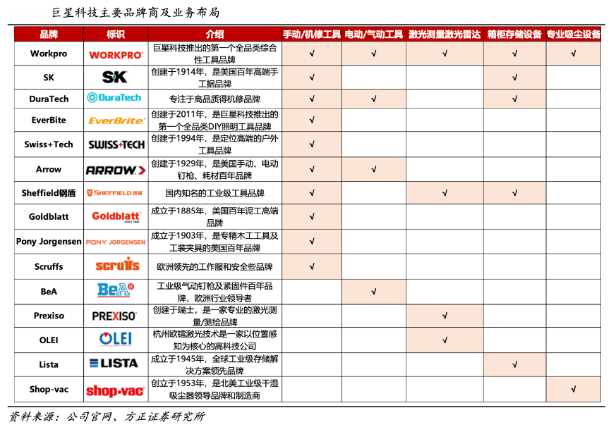 經典案例:根據公司官網、方正證券研究所等綜合資訊表明,目前巨星科技已擁有多個全球知名百年品牌和工具細分行業龍頭品牌,涵蓋業務有手動工具、電動工具、氣動緊固工具、激光測量工具、激光雷達、箱柜存儲設備、工業吸塵器等。