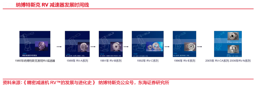 經(jīng)典案例:根據(jù)《精密減速機(jī)RVTM的發(fā)展與進(jìn)化史》納博特斯克公眾號(hào)、東海證券研究所等綜合資訊表明,自1985 年 RV 減速器問(wèn)世,納博特斯克已經(jīng)對(duì) RV 系 列產(chǎn)品進(jìn)行七次較大的迭代升級(jí),推出 RV(原型機(jī))、RV-A(內(nèi)置主軸承)、RV-B(手腕軸 專用小型系列)、RV-C(中空系列)、RV-E(提升轉(zhuǎn)矩)、RV-CA(無(wú)中心齒輪)、RV-N(小 型、輕量化)等多系列產(chǎn)品,與在載荷、輕量化、小型化等方面取得突破,產(chǎn)品性能保持行業(yè)領(lǐng)先。
