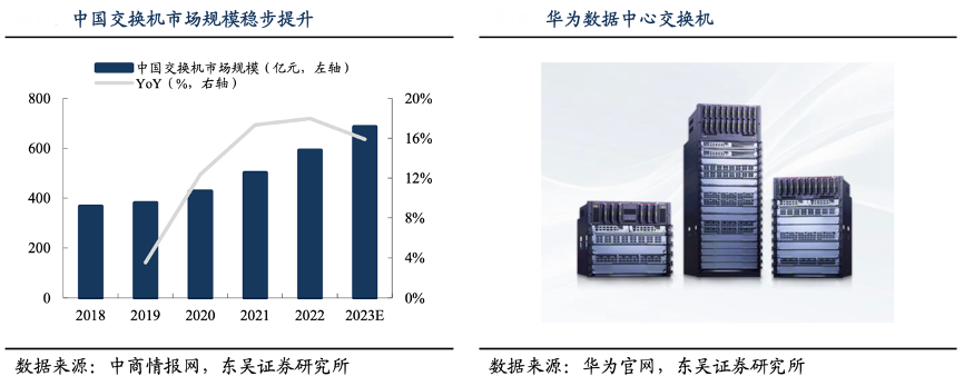 經典案例:根據中商情報網、華為官網、東吳證券研究所等綜合資訊表明,國產交換機市場規模穩定增長,華為優勢顯著。根據 IDC 數據,華為核心數據中心交換機 CloudEngine 16800 系列已達到世界領先水平,整機容 量超過 300Tbps,位居全球第一。2023年6,華為發布首款 800GE 數據中心核心交換機 CloudEngine 16800-X 系列,正式開啟數據中心 800GE 時代。根據 IDC 數據顯示,華為 在 2023H1 以 35.8%的市場份額,蟬聯中國以太網交換機市場第一,自 2016 年至今,華 為已連續 7 年穩居該領域市場第一。