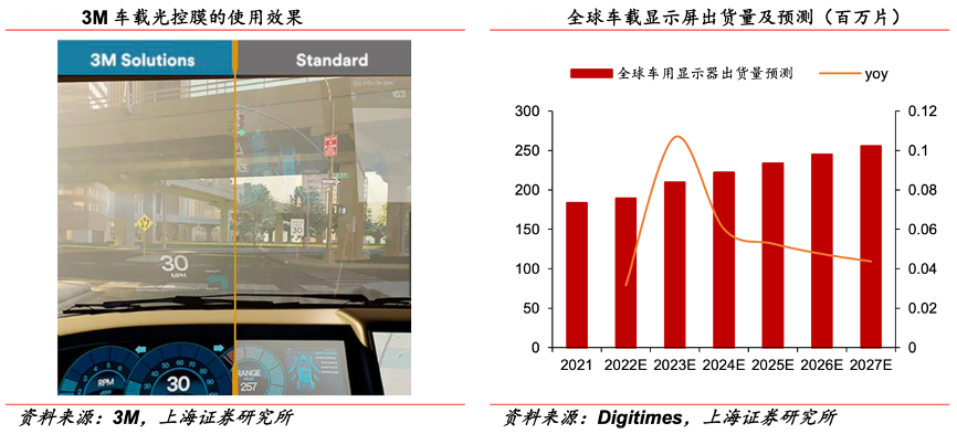 經(jīng)典案例:根據(jù)3M、Digitimes、上海證券研究所等綜合資訊表明,鼎泰高科公司光控膜產(chǎn)品定位國(guó)產(chǎn)替代,市場(chǎng)空間廣闊。車載顯示屏規(guī)模和尺寸雙增趨勢(shì)明確,車載光控膜通過控制光線的出光角度,能夠有效解決大屏顯示屏在汽車前檔風(fēng)玻璃上的倒影成像問題,具備較大的市場(chǎng)空間潛力。目前車載光控膜市場(chǎng)主要由 3M 等外資公司掌控,國(guó)產(chǎn)替代空間大。