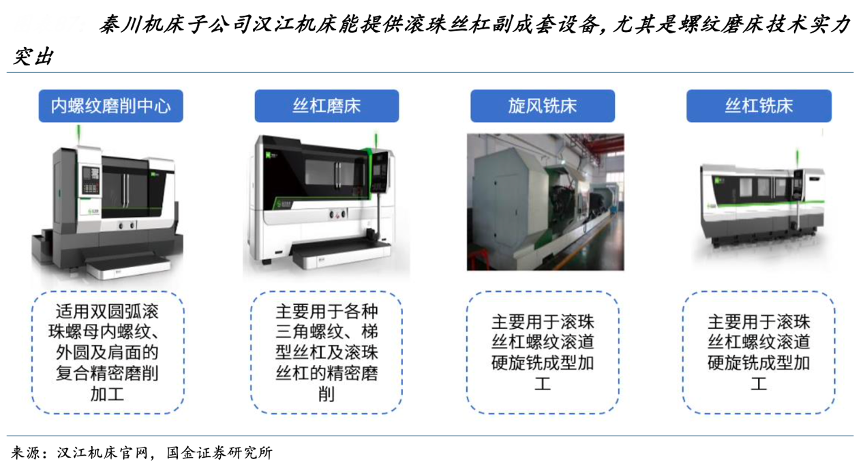 經(jīng)典案例:根據(jù)漢江機床官網(wǎng)、國金證券研究所等綜合資訊表明,秦川機床子公司漢江機床為國內(nèi)螺紋磨床主導企業(yè),能夠提供滾珠絲杠副成套設備,2022 年漢江機床營業(yè)收入 4 億元(除磨床外還直接銷售滾動功能部件)。子公司格蘭德在磨床 領域也開發(fā)了外圓磨床、萬能外圓磨床、端面外圓磨床、軸承磨床、球面磨床、外圓系列 數(shù)控磨床、汽車及工具行業(yè)專用磨床等 11 大類、110 多個品種、150 多個規(guī)格。