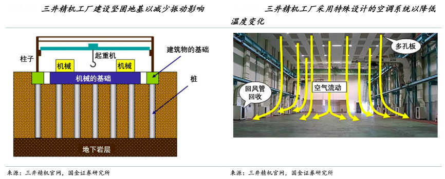 經典案例:根據三井精機官網、國金證券研究所等綜合資訊表明,為了實現高精度機床制造并保持較高產品一致性,三井精機在工廠建設、制造/裝配工藝 等領域不斷精進,其工廠建設為了確保地基 水平與降低外部振動影響,地基由 1700 根樁打入地下基巖組成,同時建筑物的地基與設 備安裝的地基進行了隔離,確保其他振動不會對設備造成影響。同時工廠采用了特殊設計的空調系統成為天花板層流系統,將空調空氣泵入天花板,然后從眾多穿孔板中吹出小孔,朝向地板進行收集并通過回風管循環,以實現工廠在垂直/水平方向均幾乎沒有溫差,同時地面幾乎沒有風速。