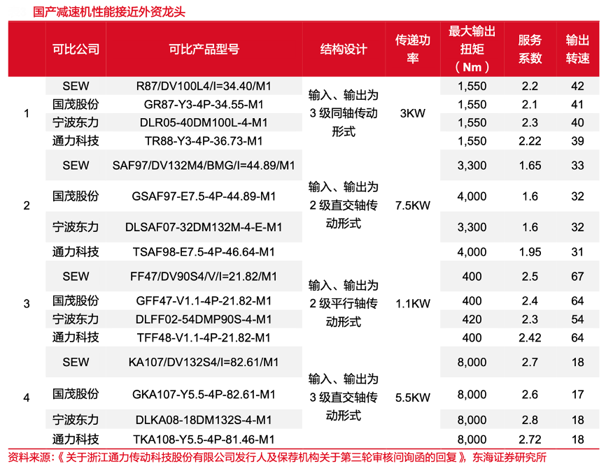 經(jīng)典案例:根據(jù)《關(guān)于浙江通力傳動科技股份有限公司發(fā)行人及保薦機構(gòu)關(guān)于第三輪審核問詢函的回復》、東海證券研究所等綜合資訊表明,2012年以來,國內(nèi)減速機技術(shù)快速發(fā)展,在產(chǎn)品性能上逐漸接近外資品牌,靜態(tài)參數(shù)如齒 輪比、扭矩、功率等基本達到相同水平。通過補足技術(shù)短板,內(nèi)資品牌產(chǎn)品硬實力逐漸提升,與渠道等軟實力形成共振,品牌認可度逐年升高,不斷擠壓進口產(chǎn)品市場份額。