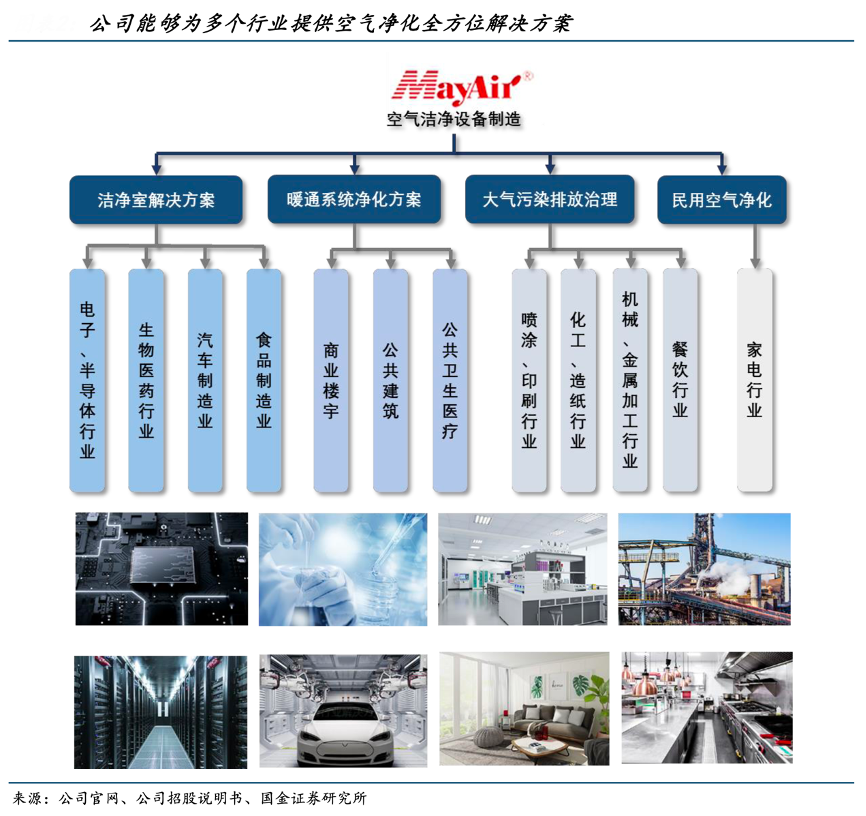 經典案例:根據公司官網、公司招股說明書、國金證券研究所等綜合資訊表明,美埃科技公司產品下游涉及多行業場景。(1)FFU+過濾器應用于半導體、生物制藥、食品加工等行業的潔凈廠房及潔凈室中;(2)空氣凈化設備用于生物制藥產線(生物安全、無菌凈化設備)、室內空氣凈化(商用、醫用、家用空氣凈化機)、工業生產(工業除塵設備/除油霧設備)、餐飲場景(除油煙凈化器)。