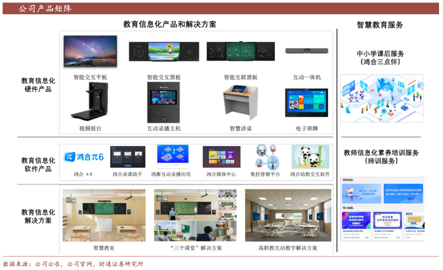 經典案例:根據公司公告、公司官網、財通證券研究所等綜合資訊表明,鴻合科技基于“一核兩翼”戰略,落地首個中小學課后服務產品“鴻 合三點伴”,提供設備互聯、數據互通、師生互動的云網端數一體化課后服務。同時進一步推進“教師信息化素養培訓服務”業務,通過“中教師訓”平臺,提升教師信息技術與教學融合創新能力。