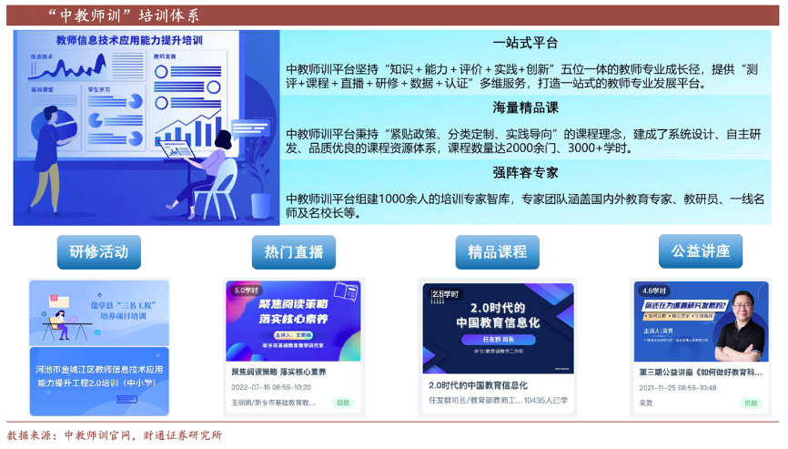 經典案例:根據中教師訓官網、財通證券研究所等綜合資訊表明,中教師訓通過“線上+線 下”混合式培訓與研修活動,精準助力教育管理部門與學校全面提升科學管理水平 及教師專業能力。截至 2022 年底,“中教師訓”已助力全國 14 個省份及眾多地市、 8 萬多所的一線中小學、幼兒園管理者及教師信息化管理或教學能力提升。
