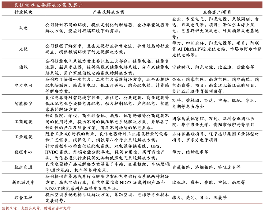 經(jīng)典案例:根據(jù)良信公眾號(hào)、財(cái)通證券研究所等綜合資訊表明,良信股份為下游多行業(yè)客戶(hù)提供配電系統(tǒng)解決方案,其客戶(hù)包括地產(chǎn)板塊的萬(wàn)科、碧桂園、保利,通信領(lǐng)域的華為、移動(dòng)、電信、聯(lián)通、新能源板塊的寧德時(shí)代、比亞 迪、制造業(yè)板塊的格力、美的、三菱,以及國(guó)家電網(wǎng)、南方電網(wǎng)等。