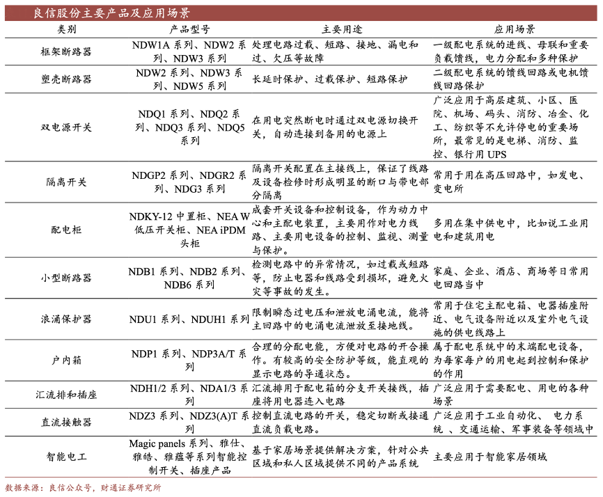 經(jīng)典案例:根據(jù)良信公眾號(hào)、財(cái)通證券研究所等綜合資訊表明,良信股份低壓電器產(chǎn)品種類(lèi)齊全,下游覆蓋板塊廣泛。公司產(chǎn)品主要包括框架斷路器、塑殼斷路器、雙電源開(kāi)關(guān)、隔離開(kāi)關(guān)、終端類(lèi)產(chǎn)品、工控類(lèi)產(chǎn)品、配電柜等低壓電器以及部分中壓產(chǎn)品,業(yè)務(wù)覆蓋地產(chǎn)、通信、新能源、電網(wǎng)、工業(yè)制造等多個(gè)下游板塊。