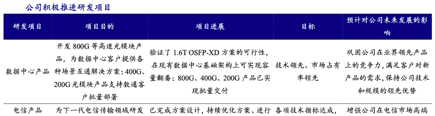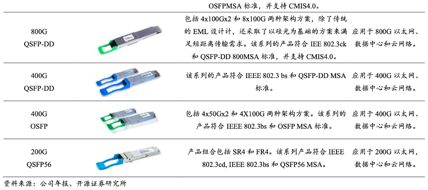 經典案例:根據公司年報、開源證券研究所等綜合資訊表明,蘇州旭創致力于高端光通信收發模 塊的研發、設計、封裝、測試和銷售,產品服務于云計算數據中心、數據通信、 5G 無線網絡、電信傳輸和固網接入等領域的國內外客戶。公司注重技術研發,并推動 產品向高速率、小型化、低功耗、低成本方向發展,為云數據中心客戶提供 100G、 200G、400G 和 800G 的高速光模塊。