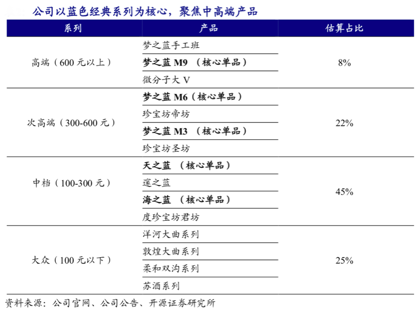 經典案例:根據公司公告、公司官網、開源證券研究所等綜合資訊表明,洋河公司“多品牌矩陣”布局完整,形成了以洋河小海、柔和雙溝、洋河藍優等為代表的大眾品牌,海之藍、天之藍、雙溝珍寶坊等為代表的中高端品牌,夢之藍M3、M6等為代表的次高端品牌,以及M9、手工班為代表的高端品牌。其中由海之藍、天之藍、夢之藍組成的藍色經典系列是公司自 2003 年以來聚焦資源打造主推產品系列,目前占公司營收比重約 75%。