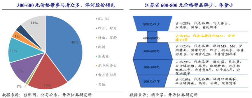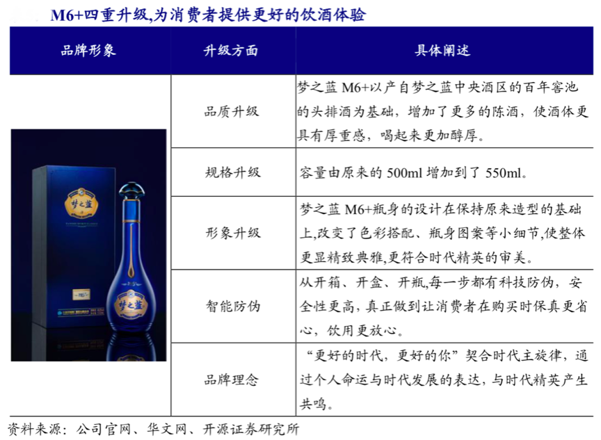 經典案例:2019年洋河對產品線做出重要調整,推出 M6+,終端零售價格700 元左右,其篩選也核心經銷商,聚焦團購市場,公司營銷資源進一步傾斜,做好 M6+消費者培育工作。根據公司公告、佳釀網、酒業家、華文網、開源證券研究所等綜合資訊表明,600-800 元價格帶是江辦省內消費即將要進入的價位段,洋河計劃2-3年將M6+打造成為50億級別單品。M6+成功可以拉升夢之藍品牌形象與價格天花板,打開夢之藍的成長空間。