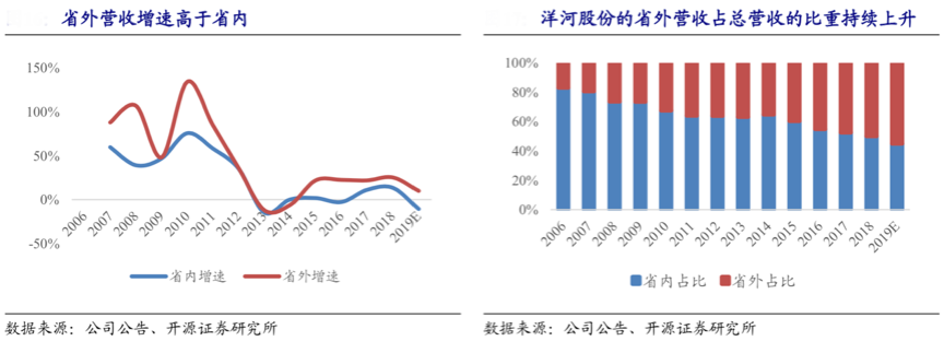 經典案例:洋河公司運作區域市場,高度重視“區域內銷外銷雙市場”,省內市場做深做透,市占率逐步提升。根據公司公告、開源證券研究所等綜合資訊表明,公司在江蘇省內確立了南京和宿遷等重點戰略市場的領導地位之后,逐步向蘇州、無錫、徐州等地區擴張,完成了全省范圍內市場布局,并于2013 年,公司提出打造“新江蘇市場”的目標,將省外銷售超過800萬元的縣和超過1500萬元的市確定為“新江蘇市場”。現階段主要是開發新江蘇市場的“5+2”市場(“5”指上海、浙江、安徽、河南、山東,“2”指湖北和河北)。截至2019 年中,公司在全國共形成570個新江蘇市場,占省外銷售營收比重 70%以上。