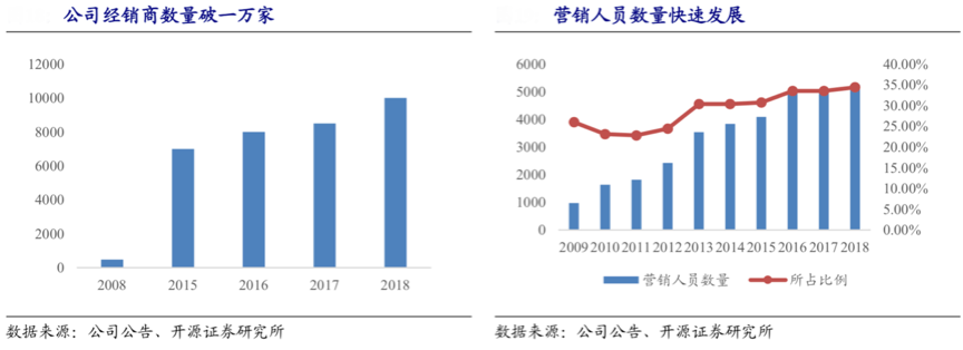經典案例:根據公司公告、開源證券研究所等綜合資訊表明,洋河股份率先采取經銷商與廠商“1+1”共同運作市場的渠道模式,渠道結構上,渠道商、團購商、負責商超的經銷商等多種經銷商類型并存。洋河股份經銷商數量從 2008 年的 475 家增至 2018 年超 10000 家。營銷網點從 2008 年 42 個增至 2018 年 316 個,輻射半徑逐漸從省、地市縮小至縣、鄉鎮范圍。2018 年洋河股份銷售人員數量超 5000 人,占總人員比例高達 34%,加上 35000 人的編外地推隊伍,銷售團隊人數位居行業第一。