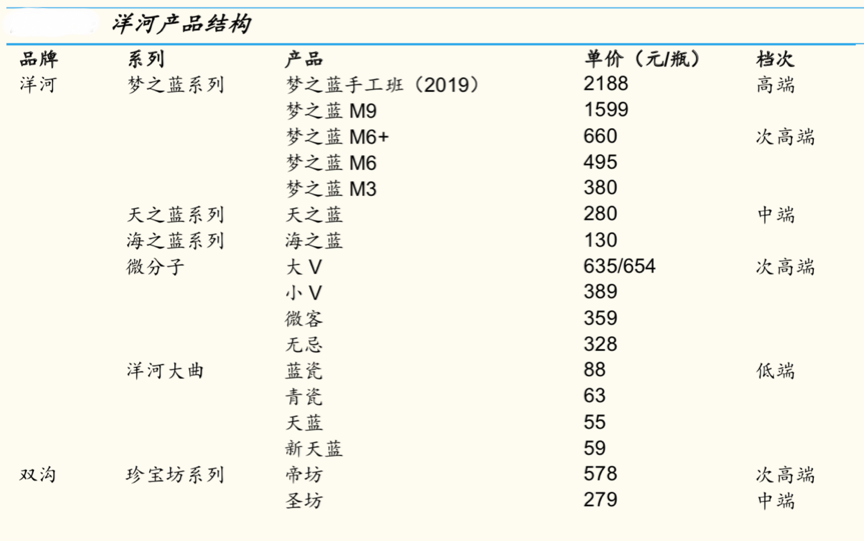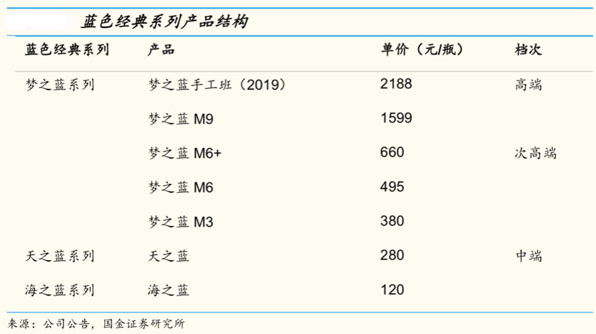 經典案例:據國金證券等公開資訊表明,在產品策略上,洋河由原本的省外主推海天,省內主推夢系列轉變為省外加大夢系列的推廣,實現產品結構升級,省內主推夢 6+和夢之藍手工班,以期進一步加強品牌力,打開次高端空間。夢系列在次高端中具有更好的 產品組合優勢,中端的基礎產品海之藍與天之藍市場容量大,消費者眾多, 因此相對其他缺乏基礎產品的次高端產品而言,夢之藍具有更強大的品牌 基礎,有望在省外持續實現較好的增長。
