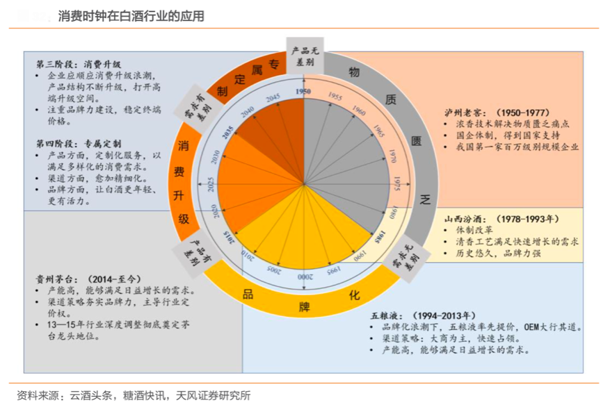 據云酒頭條、糖酒快訊、天風證券研究所等綜合資訊顯示,“消費時鐘”在白酒行業應用廣泛,白酒行業已經從物質匱乏、品牌化階段發展到消費升級及專屬定制的階段,高端白酒消費的個性化和主題化日益增強,基于團體消費定制、區域白酒文化定制等白酒消費服務的市場日益擴大。