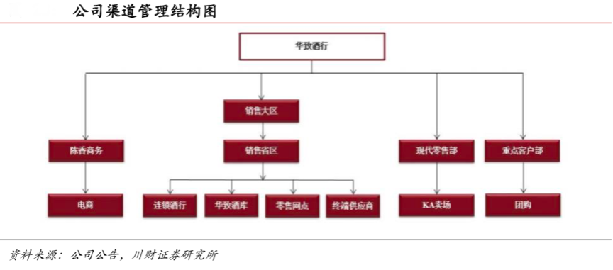 經典案例:華致酒行在渠道管理結構方面,其將全國市場劃分為四個銷售大區,并在各個銷售大區下分設省區以進行管理、加強渠道開發,同時公司在銷售大區外獨立設立重點客戶部、現代零售部、子公司陳香商務負責管理及拓展公司的團購、KA、電商渠道。