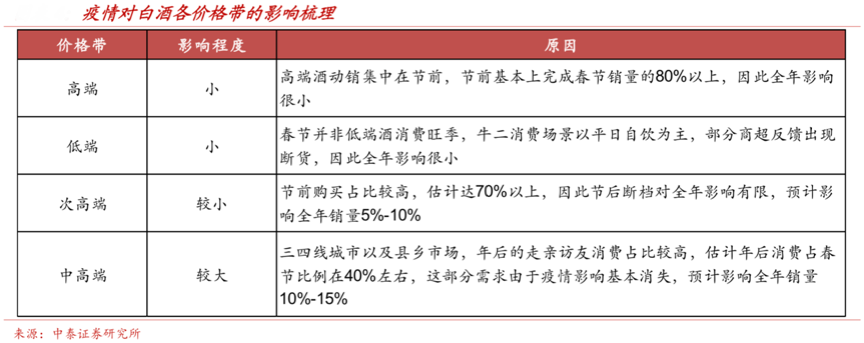 無高端品牌,無高端產品,白酒品牌無法搶占“競爭制高點”,沒有強大的明星白酒產品,企業的競爭“天花板”將持續存在,無法提升品牌的高度認知,無法活化白酒的消費價值,另據中泰證券研究所等綜合資訊表明,疫情對白酒各價格帶的影響除中高端白酒外基本較小,高端白酒對于企業來說是一個巨大的“市場競爭利器”,活化品牌形象,點亮品牌價值,拉升產品整體價格檔次,延展產品價格區間,白酒企業自然可以借勢擴張。