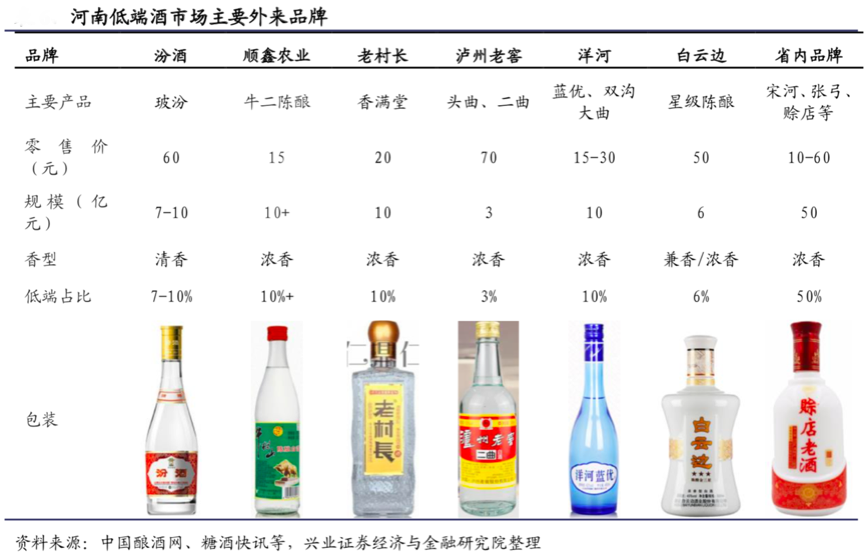 據中國釀酒網、糖酒快訊、興業證券等綜合資訊顯示,河南18個地市約88個縣,幾乎縣縣都有自己的酒廠,近一半的低端酒市場由地產白酒占據,如杜康在洛陽占絕對優 勢;張弓和宋河在永城有一部分消費群;許昌地區消費能力有限,鹿邑大曲、賒 店、仰韶等表現較好;雞公山在信陽規模超過 2 億元等。