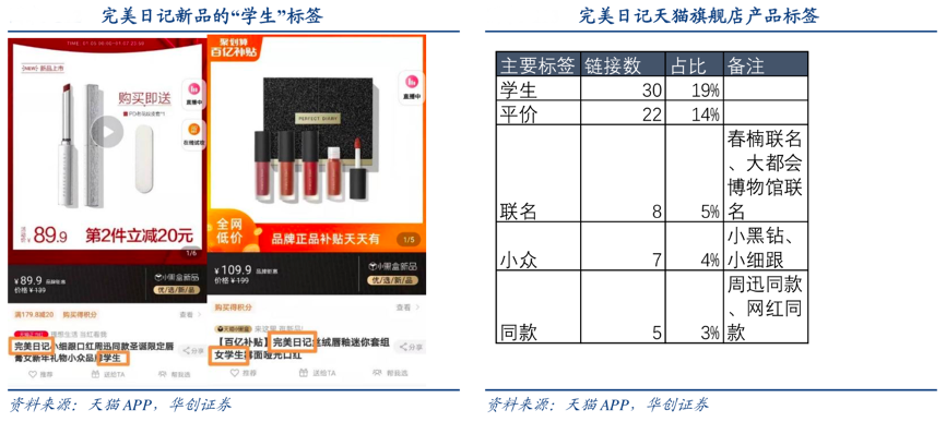 經典案例:根據天貓APP、華創證券等綜合資訊表明,國際大牌化妝品品牌的單價通常 150~400 元之 間,對美妝預算有限的學生黨和想要試錯的美妝小白來說門檻較高。完美日記將學生黨作為種子用戶:在天貓旗艦店等線上渠道,將“學生”納入其搜索關鍵詞/產品名稱,和其捆綁在一起,加深目標消費群體“學生友好”標簽印象。