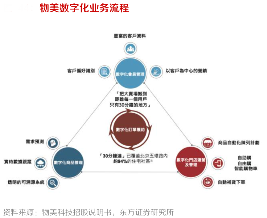 經典案例:根據物美科技招股說明書、東方證券研究所等綜合資訊表明,“物美集團”是國內零售企業數字化轉型的典型范例,具有豐富的數字化轉型經驗。以數字化訂單為例,物美的“30 分鐘達”服務已覆蓋北京市五環內94%的住宅區,且可為用戶提供 8,400 個 SKU,遠高于同期同行業約 3,000 個 SKU 的平均水平。