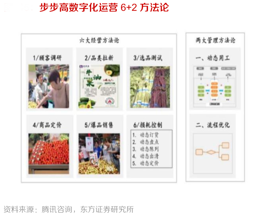 經典案例:根據騰訊咨詢、東方證券研究所等綜合資訊表明,步步高 2018 年戰略重心重回超市主業以來,營收增長穩健,同年引入騰訊、京東兩大戰略投資者,以其數據產品、供應鏈能力賦能零售, 提升公司數字化運營能力,實現線上流量的多元化經營。2019 年初,步步高圍繞生鮮為核心,深化供應鏈改革,統一前臺運營、中臺統籌和后端采購全流程環節。