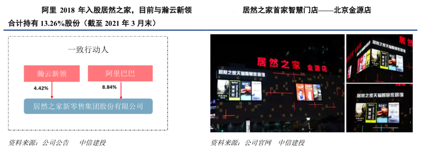 經典案例:根據公司公告、公司官網、中信建投等綜合資訊表明,居然之家 2018 年初開始與阿里巴巴達成深度戰略合作,以大數據平臺建設為核心,全面推進線上線下融合,打造家居新零售新模式。2018 年 2 月 11 日,阿里巴巴以 54.53 億元收購居然之家 15%股份,借殼上市后目前阿里持有公司股份 8.84%成為公司第三大股東,借助阿里巴巴強大的大數據、云計算、智能硬件等零售技術能力,居然之家圍繞賣場數字化、線上增量平臺、門店存量轉化等三方面對賣場進行持續改造升級。