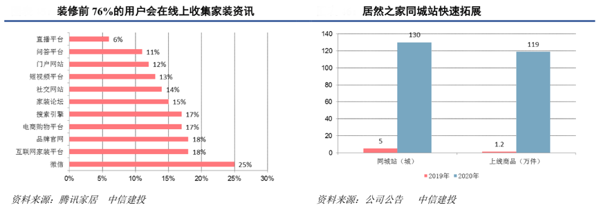 經典案例:根據公司公告、騰訊家居、中信建投等綜合資訊表明,居然之家與阿里巴巴攜手對天貓平臺的“居然之家”官方旗艦店進行了改造升級,將傳統的電商店鋪升級為基于本地化特色商品及服務的“同城站”。2020年居然之家公司加速推動同城站建設,以同城站為核心,以直播為前端營銷抓手,賦能本地經銷商,最終轉化線上消費轉回線下實體店,實現線上線下融合。2020 年,公司同城站從 年初的覆蓋 5 城快速增長至 130 城,上線商品從年初的 1.2 萬件增加至 119 萬件,全年同城站引導成交 84.5 億 元。