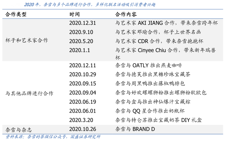 經典案例:根據奈雪的茶微信公眾號、國盛證券研究所等綜合資訊表明,奈雪的茶公司通過在微信、小紅書及微博等各種社交媒體平臺的各種創新的營銷 活動及特惠活動積極吸引顧客,樹立品牌知名度。2020年3月,奈雪正式上線天貓旗艦店同時,其于 2020 年 3 月與薇婭合作的直播間內,三秒售罄 14 萬多杯茶飲+7萬多個軟歐包。