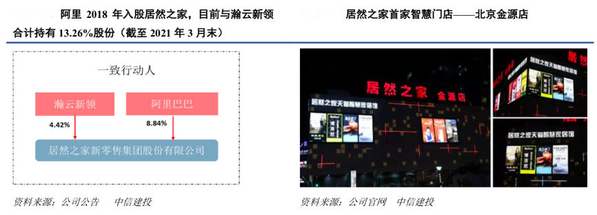 經典案例:根據公司公告、中信建投等綜合資訊表明,居然之家 2018 年初開始與阿里巴巴達成深度戰略合作,以大數據平臺建設為核心,全面推進線上線下融合,打造家居新零售新模式。2018 年 2 月 11 日,阿里巴巴以54.53 億元收購居然之家 15%股份,同時其借助阿里巴巴強大的大數據、云計算、智能硬件等零售技術能力,居然之家圍繞賣場數字化、線上增量平臺、門店存量轉化等三方面對賣場進行持續改造升級。