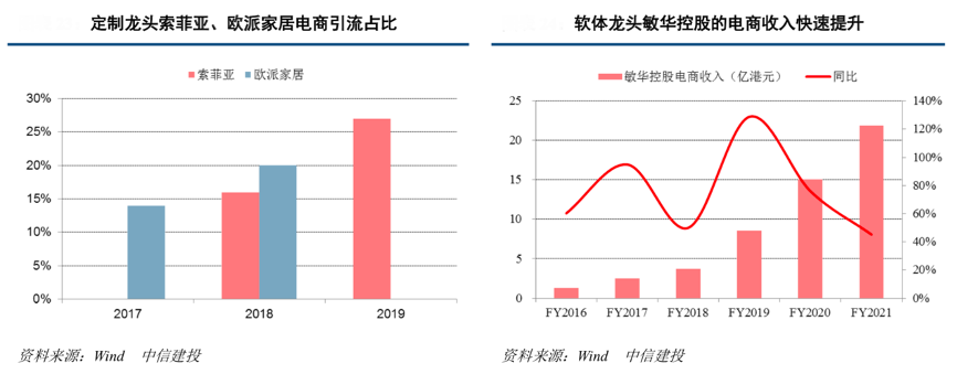 經典案例:根據wind、中信建投等綜合資訊表明,以定制家居為例,盡管由于其高單值、重服務、講體驗等仍以線下成交為主,但線上引流、線上線下一體化消費場景正在形成,線上占比逐步提升,其中 2019 年歐派 家居電商引流收入占比預計超 20%,索菲亞線上引流客戶占比從 2018 年的 16%提升至 2019 年的 27%。而軟體家具由于服務屬性較輕,可在線上直接形成交付,電商也成為龍頭發力的有效渠道。其中敏華控股 2020 財年電商收入同增超 80%,內銷收入占比同比大幅提升 9.2pct 至 27.8%;2021 財年電商收入同比增長超 45%,占比保 持24%+。