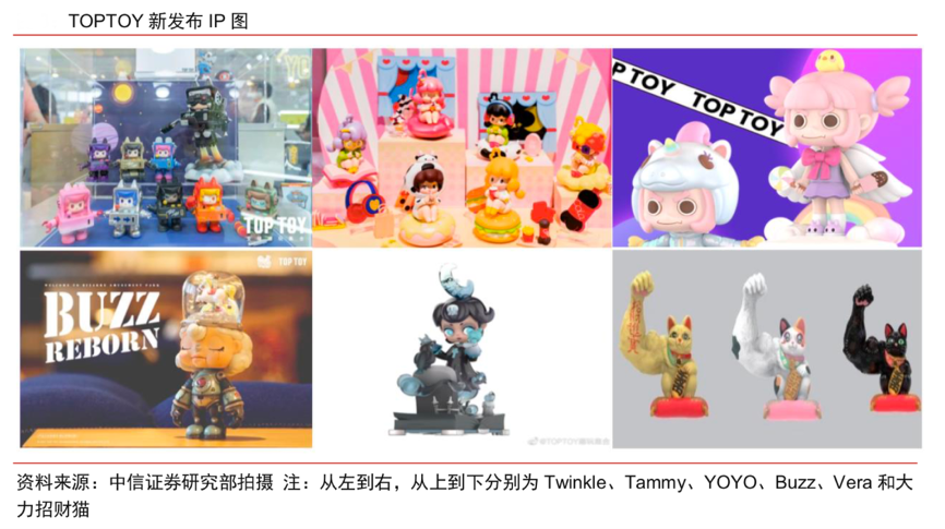 經典案例:根據中信證券研究部等綜合資訊表明,名創優品于 2020 年 12 月宣布成立子品牌 TOPTOY,致力打造于亞洲潮流文化集合地。2021年 4 月 28 日,TOPTOY 成立原創設計中心,并舉辦新 IP 發布會。TOPTOY 新發型的 IP 包括:1)Twinkle:街機男孩形象;2)Tammy:宅家的軟萌少女形象;3)YOYO: 幼兒園小朋友形象;4)Buzz:尋找愛和快樂的孩子;5)Vera:魔法世界的小精靈;6) 大力招財貓:寓意發財。