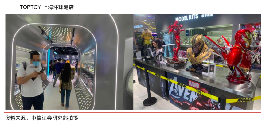 經典案例:根據中信證券研究部等綜合資訊表明,TOPTOY 上海首家線下門店環球港店于 2021 年 4 月 28 日開業,門店 面積約 600 平米,匯集 HelloKitty、漫威、迪士尼、DC、火影忍者等全球頂級 IP 及潮玩品牌;此外TOPTOY 最新 IP 如 Twinkle、Tammy、YOYO、Vera 等也在門店同步上線。 門店設置了抽盲盒、置手辦、玩拼裝、收藏 BJD 娃娃及設計師簽售等創新互動,實現“逛、玩、購”一體化。截至 2021/3/31,TOPTOY 已在全國 15 個城市布局 25 家線下實體門店; TOPTOY 計劃 2021 年全年新開約 90 家線下實體門店和 500 家機器人門店。
