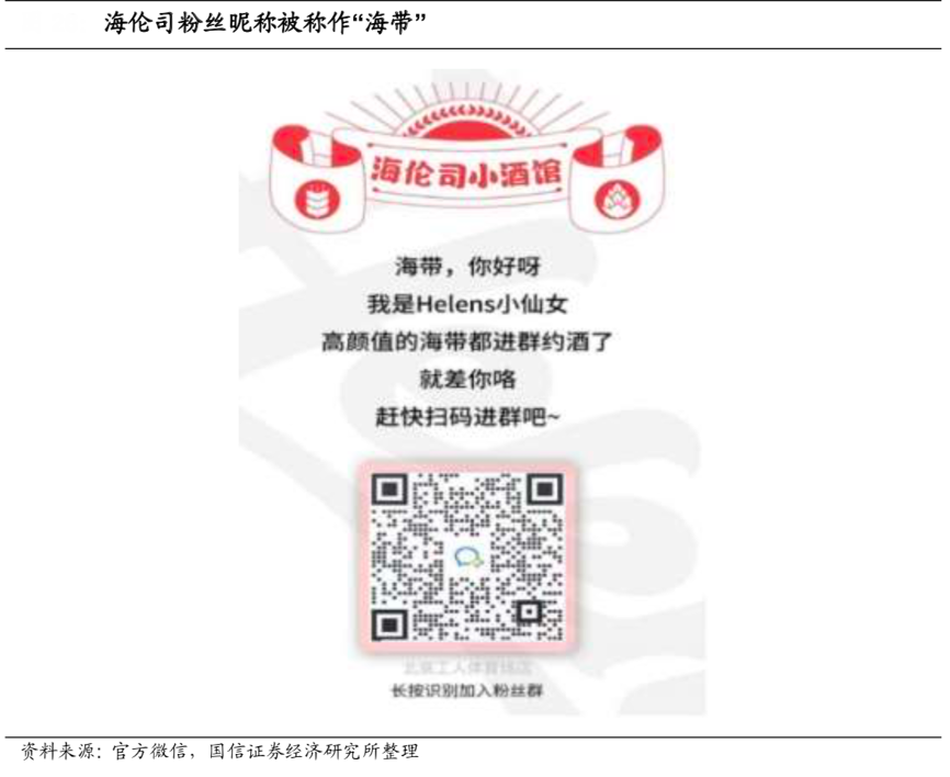 經典案例:根據官方微信、國信證券經濟研究所等綜合資訊表明,每家海倫司門店均會建立微信粉絲群,具體加群方式在官方微信公眾號上對應門店信息處均可找到入口。微信顧客群的建立,可以給酒館類消費業態顧客更多互動聯系的機會,將社交場景由門店遷移至線上渠道,而這種消費社交場景的遷移對酒 館類陌生人社交為主的業態尤其重要。