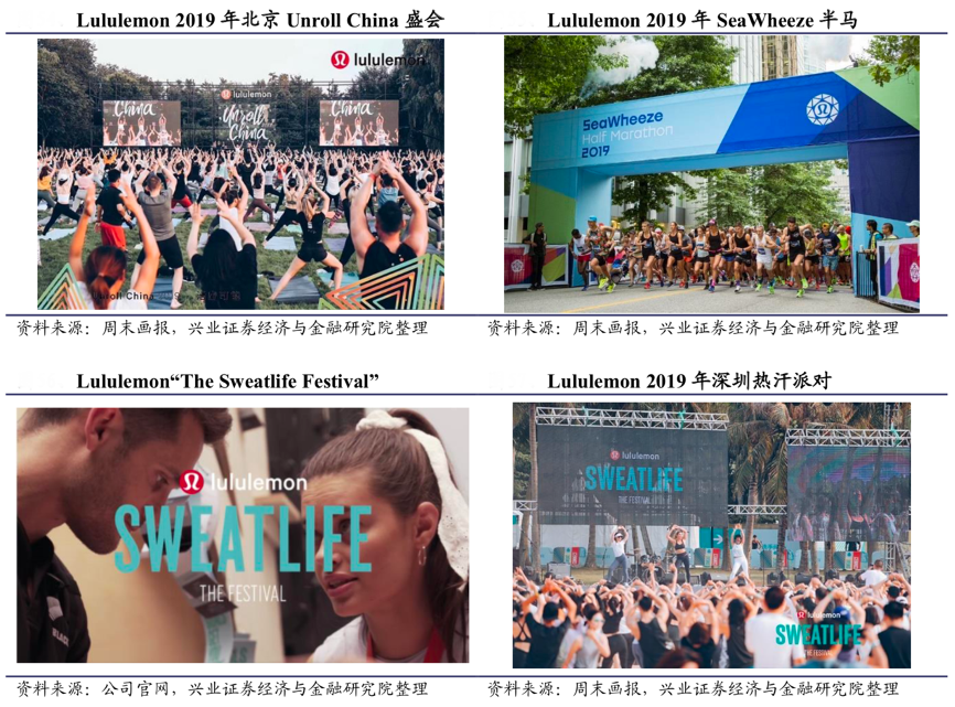 經典案例:根據周末畫報、公司官網、興業證券經濟與金融研究院等綜合資訊表明,Lululemon 基于店鋪開展社群活動,分店內和店外兩種形式。其社群活動會邀請品牌大使進行分享,但不局限于品牌大使。 lululemon官方還會定期舉辦大型的戶外活動,形式多樣,運動也不局限于瑜伽。 例如傳統的 The Sweatlife Festival。這些活動的目的是為了宣揚 lululemon 健康運 動生活的理念,不以“帶貨”為目的。