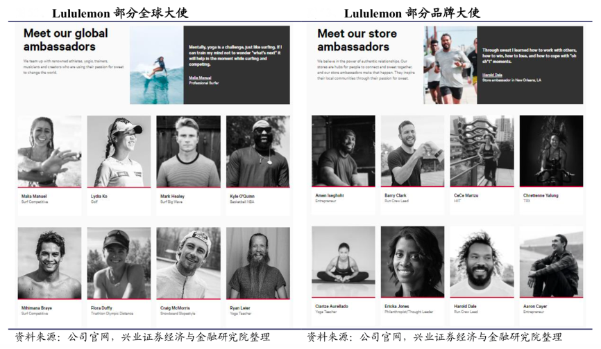 經典案例:根據公司官網、興業證券經濟與金融研究院等綜合資訊表明,相較于簽約體育明星等擁有泛化粉絲群體的傳播方式不同,lululemon選擇與區域內 KOL 合作打造品牌大使成本更低且更高效。Lululemon 品牌大使包括全球大使和門店大使。截止 2021 年 4 月 19 日,lululemon 全球大使共 42 位,囊括了瑜伽、冥想、游泳、馬拉松、拳擊等領域的杰出運動員。門店大使范圍更寬泛,還包括企業家、演講者、營養師、音樂家等各個領域。這其中最重要的品牌大使是瑜伽場館教練,lululemon 為品牌大使提供諸多福利,包括服裝配額、新品試穿、官網等社交媒體宣傳等,lululemon 把每一座瑜伽館,都變成了售賣場。