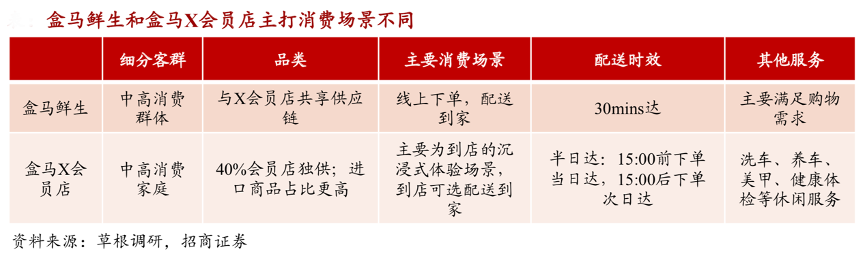 經典案例:根據草根調研、招商證券等綜合資訊表明,目前盒馬鮮生的線上化率達60%以上,更多是強調到家,消費者下單能夠享受即時配送。X會員店為消費者提供一個到店的沉浸式的體驗場景,以“逛”的體驗為主,結合購買家庭所需生鮮、烘焙、零食等同時享受其他休閑服務,感受更有溫度的購物體驗。