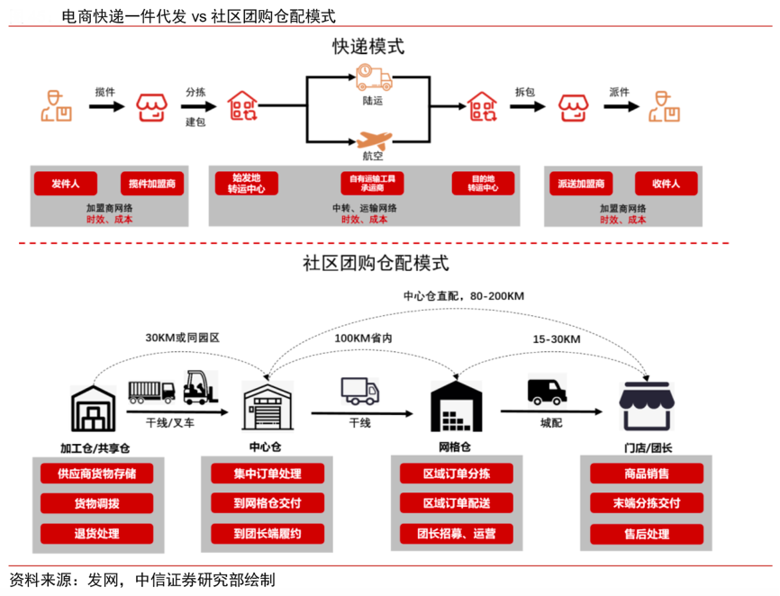 經典案例:根據發網、中信證券研究部等綜合資訊表明,社區團購是目前零售業態尤其是低線市場最貼近消費者的存在。由于供應鏈的流轉節點更少,并且平臺撬動了大量社會閑置資金和人員加入倉配體系中,通過更加粗放的社會化管理和分工方式代替了傳統零售門店的管理模式,刺激了各個環節的生產經營效率,規模效應擴大后的單件物流成本遠低于一件代發的電商 B2C 零售體系和傳統經銷渠道網絡。