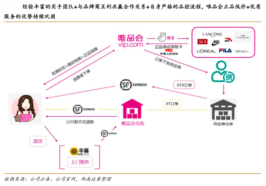 經典案例:根據公司公告、公司官網、西南證券等綜合資訊表明,為了避免較長的銀行退 款流程,便于客戶的二次購買以及資金回流,唯品會通過優化“退款節點”以及“退款路徑” 來實現快速退款服務。一旦完成收貨,唯品會將會以付款方式,將訂單退款按照客戶的付款方式原路返還給客戶,提升了客戶退貨體驗。唯品會通過“品牌折扣+限時搶購+正品保障”的商業模式進行營銷,激發消費動力,保證庫存清理能力。