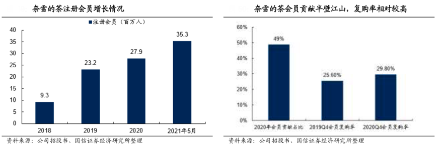 經典案例:根據公司招股說明書、國信證券經濟研究所等綜合資訊表明,奈雪的茶公司從 2019 年 9 月推出奈雪的茶會員體系,注冊會員人數由截至 2019 年底的 9.3 百萬人大幅增至截至 2020 年末的 27.9 百萬人及 2021 年 2 月 5 日的 35.3 百萬人,會員規模快速擴大。截至 2020 年奈雪的茶訂單總數的約 49.0%來 自會員貢獻,顯示其會員認可度較高。公司活躍會員人數由 2019Q4 的 2.0 百 萬人增加至 2020 Q4 的 5.8 百萬人。