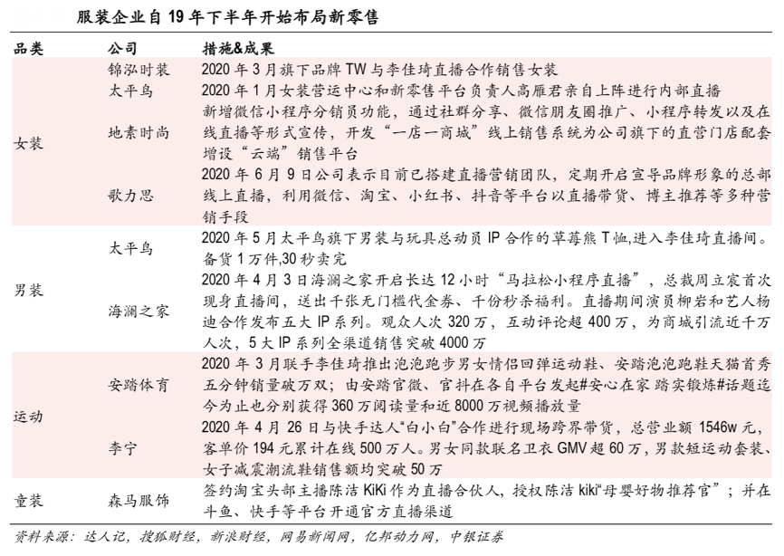 經(jīng)典案例:根據(jù)達(dá)人記、搜狐財經(jīng)、新浪財經(jīng)、網(wǎng)易新聞網(wǎng)、億邦動力網(wǎng)、中銀證券等綜合資訊表明,紡織服裝龍頭品牌近年來大力布局線上渠道,積極開拓電商業(yè)務(wù),探索新零售渠道。例如森馬服飾簽約淘寶頭部主播陳潔Kiki 作為直播合伙人,積極開展童裝等領(lǐng)域的帶貨;太平鳥通過微信線上會員專場、小程序分銷、直播等創(chuàng)新場景打通與消費者的連接,利用大數(shù)據(jù)進行多維度精準(zhǔn)營銷。