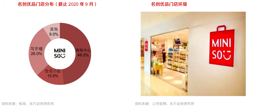 經(jīng)典案例:根據(jù)極海、公司官網(wǎng)、東方證券研究所等綜合資訊表明,截止 2020 年 9 月末,近 50%名創(chuàng)優(yōu)品門店選址高流量的購物中心。其建立了一系列的標(biāo)準(zhǔn)制度指導(dǎo)門店裝修和商品陳設(shè),具有三大特征: 白色基調(diào)、空間開闊和太空箱。其在貨架高度、貨品陳列方面也進(jìn)行詳細(xì)研究,打造令顧客滿意的購物環(huán)境。店內(nèi)不設(shè)導(dǎo)購,給予消費(fèi)者充分的挑選空間。根據(jù)公司披露的數(shù)據(jù),消費(fèi)者對商品、 服務(wù)和門店環(huán)境的好評率均在90%左右。