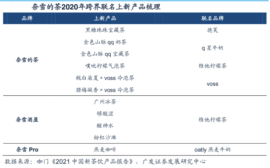 經典案例:根據咖門《2021中國新茶飲產品報告》、廣發證券發展研究中心等綜合資訊表明,奈雪的茶近年來聯名跨界合作頻出,通過和人民日報、抖音、王者榮耀、李寧等不 同領域的機構和公司以及各種美術展、藝術展的合作,組織線上和線下推廣活動,推出限量版茶飲、茶杯以及推出聯名新品等嘗試,加強在消費者各類生活場景的滲透,傳達品牌形象和品牌文化。