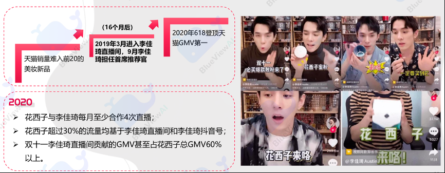 經(jīng)典案例:根據(jù)《藍(lán)色光標(biāo)-化妝品行業(yè):新國貨彩妝洞察》、公司官網(wǎng)等綜合資訊表明,KOL選擇上,花西子慧眼識佳琦搭上直播首班快車,長期深度合作持續(xù)引流,李佳琦作為花西子主要的曝光點,不僅是花西子 的最大流量源,也是花西子最大的銷量源;在李佳琦直播間,能夠看出花西子與其達成的深度合作意向。